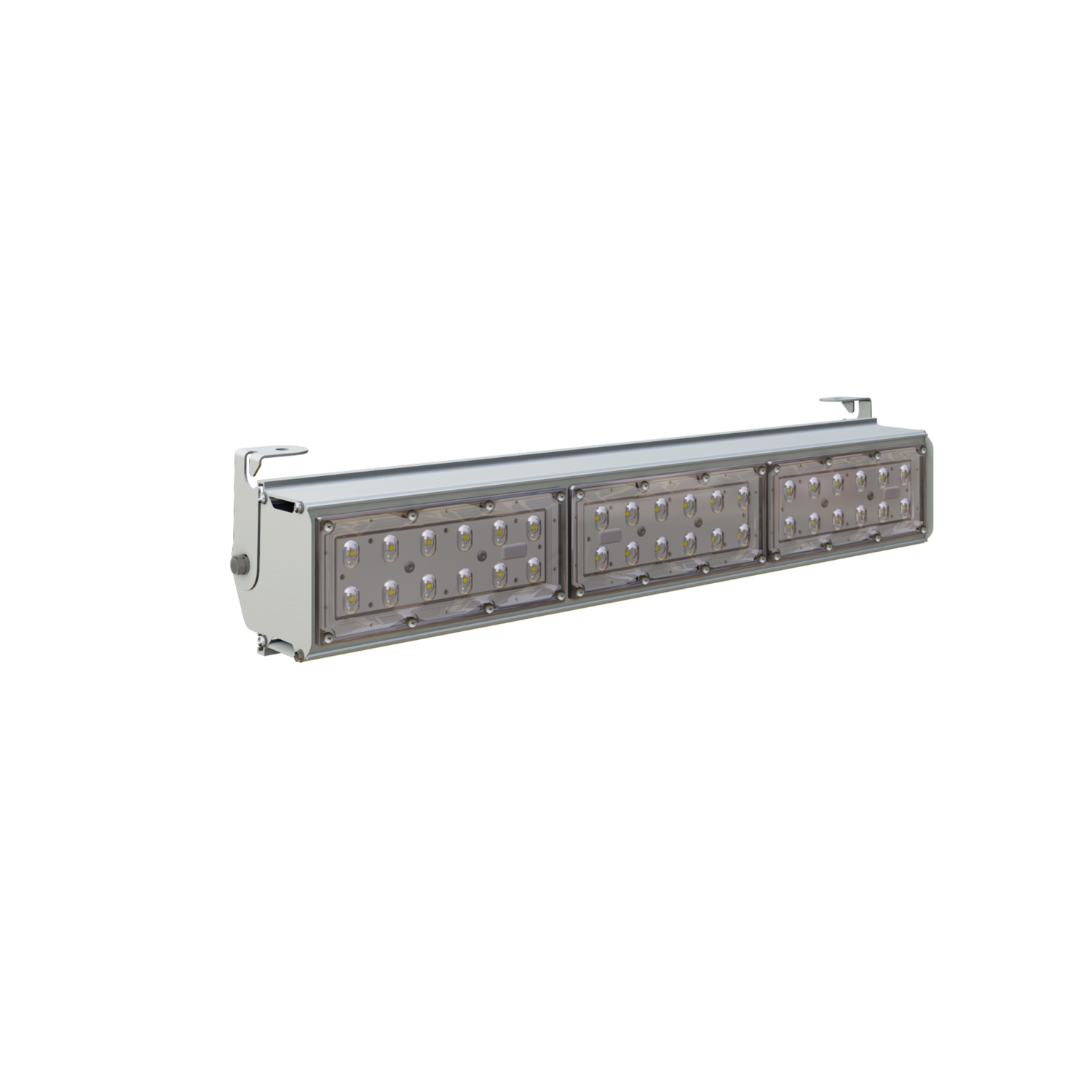 В светильнике разработан универсальный Г-образный кронштейн для монтажа на вертикальных и горизонтальных поверхностях, а также на трос.
