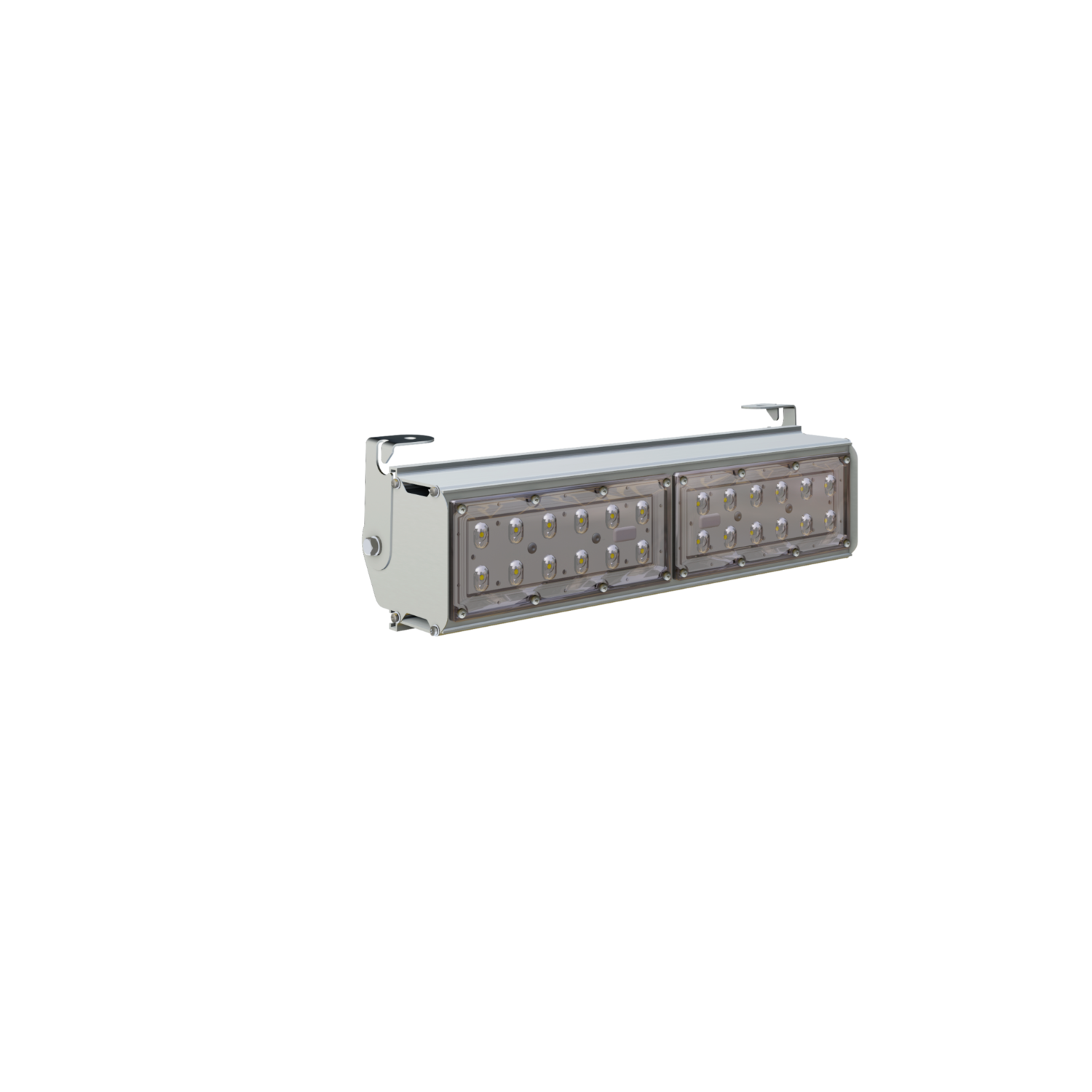 В светильнике разработан универсальный Г-образный кронштейн для монтажа на вертикальных и горизонтальных поверхностях, а также на трос.