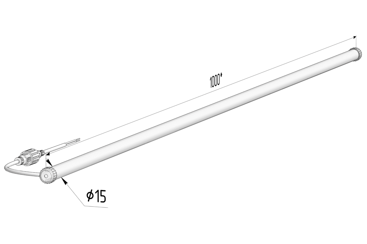 Корпус светильника изготовлен из ударопрочного оптического поликарбоната в форме трубы диаметром 15 мм. Торцы трубы закрываются заглушками, установленными на эластичный силиконовый клей-герметик. Возможно размещение светильников в непрерывную линию длиной до 30 метров.