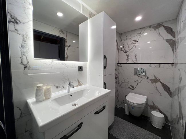 На заметку. Светлая отделка отражает до 80% светового потока, а вот темная плитка, напротив, поглощает до 88% света. Если вы выбрали для санузла темную отделку, мощность и количество светильников нужно увеличивать. Также избегайте направлять яркий свет на глянцевые поверхности — это создаст неприятные блики и подчеркнет малейшие дефекты укладки плитки.