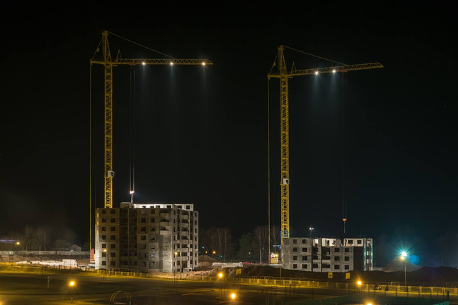 Для освещения строительных объектов подходят промышленные светодиодные прожекторы и светильники. Оборудование должно обладать стойкостью к пыли, влаге и механическим воздействиям. Степень защиты приборов соответствует классу IP65 или выше. Приборы должны иметь возможность регулировки угла освещения. Для больших открытых пространств применяют осветительные мачты — стационарные или мобильные. Такие установки несут на себе несколько мощных источников света и способны осветить значительную площадь с одной точки.