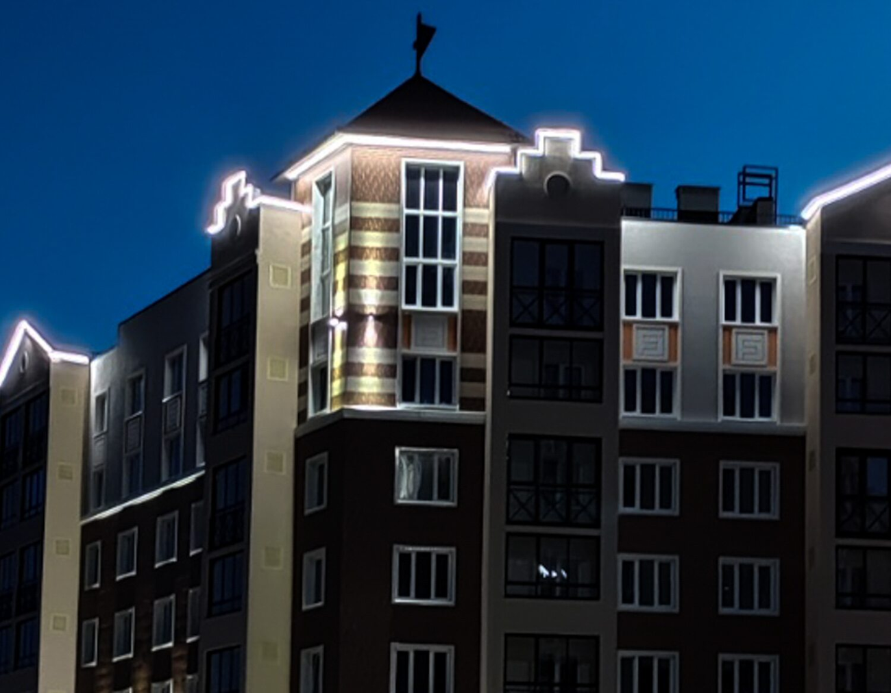 Контурное освещение: создает световой контур здания, подчёркивая его силуэт на фоне тёмного неба