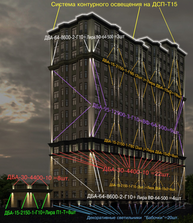 Акцентирующее освещение: служит для выделения определённых элементов здания (балконов, колонн, арок и т.д.)