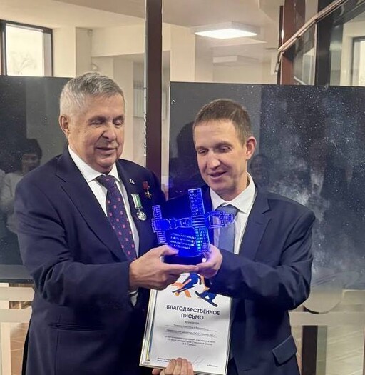 На встрече в Детском космическом центре Виктор Петрович вручил генеральному директору "Мастер ЛЕД" Александру Рычкову грамоту за помощь в организации соревнований.